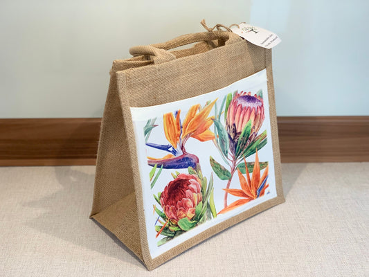 Protea and Strelitzia Jute Bag with fabric pocket. Eco-friendly Hessian Burlap Tote Reusable