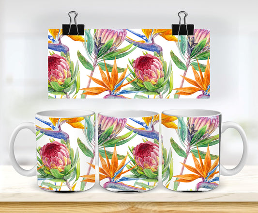 Protea and Strelitzia ( Bird of Paradise Flower ) 11oz mug. South African flowers Bright and colourful.