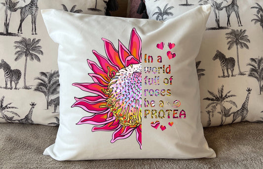 Plush White Protea cushion “In a world full of Roses be a Protea” deluxe 'soft feel' scatter cushion. ( 40x40cm )Hot pink protea.