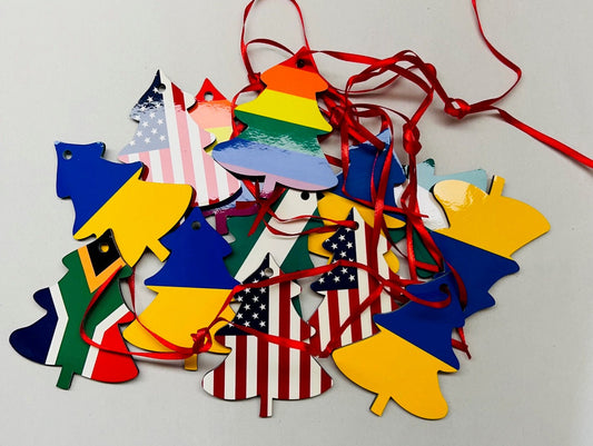 Personalised Christmas tree decoration, double sided hand printed 'Flags of the World' hanging decoration. Christmas hanging ornament.