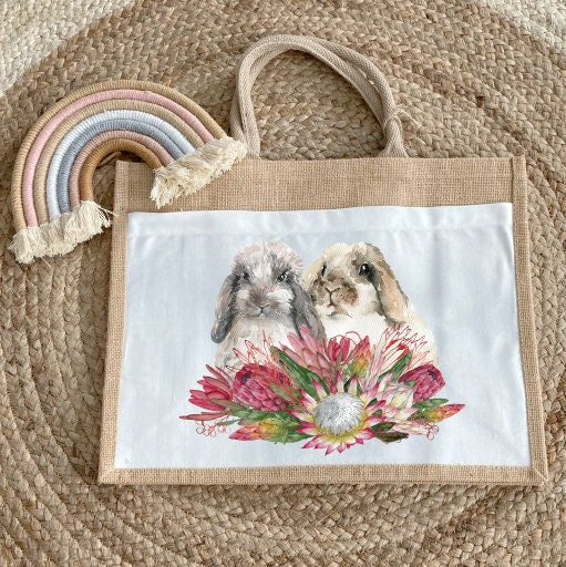 Protea and Rabbits Bunnies Easter Bunny Jute Bag with fabric pocket. Eco-friendly Hessian Burlap Tote Reusable. Easter gift. Spring gift.