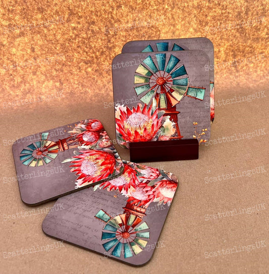 Protea Coasters with optional Display Stand set of 4 Windmill bright pink Proteas South African Australian Karoo gift birthday Mother’s Day