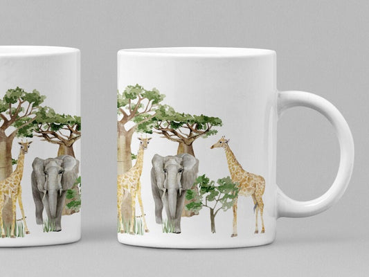 Safari mug South African animals Boab tree Tea Coffee Hot Chocolate mg 11oz South Africa mug. Giraffe Elephant Zebra Lion