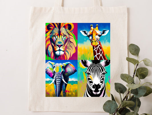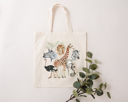 Safari tote bag, Giraffe, Elephant,Lion, Ostrich, Rhinoceros, Zebra, African Animals. South Africa reusable. Eco-friendly