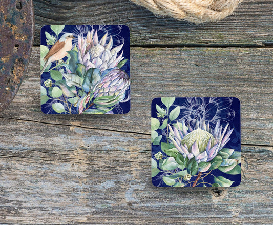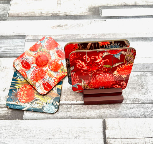 Set of 4 Coasters with optional Display Stand, South African Protea and Hydrangea/Rhododendron. ( 9x9cm )