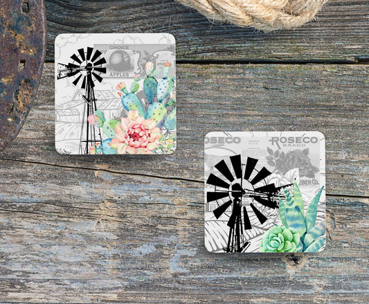 Set of 4 Coasters with optional Display Stand, Cactus Prickly Pears and Karoo Windpomp. Set of 4 South African 9x9cm coasters.