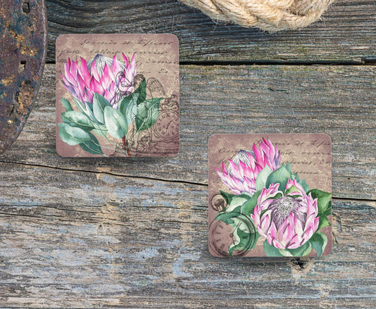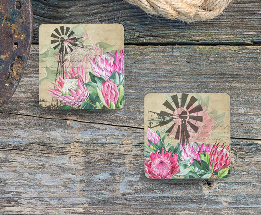 Set of 4 Coasters with optional Display Stand, Vintage Proteas. South African coasters. ( 9x9cm )