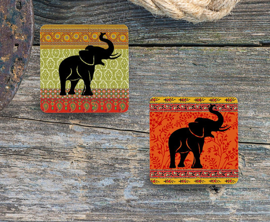Set of 4 Coasters with optional Display Stand, Elephant with different vibrant coloured backgrounds. Elephant gift. ( 9x9cm )