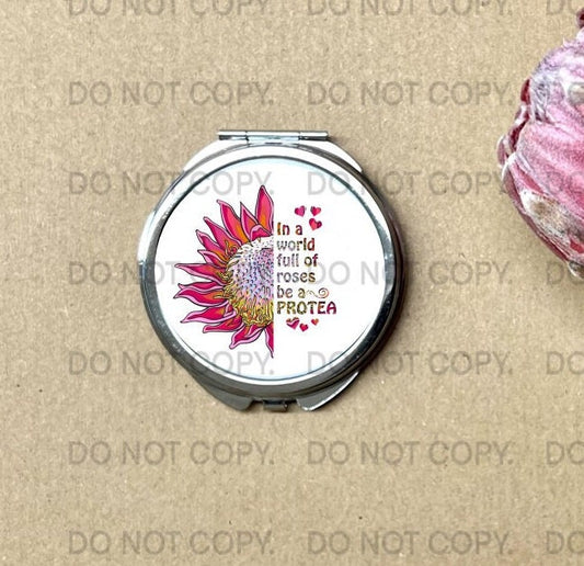 Small hand bag mirror with the motivational quote " In a world full of roses be a protea" Pink protea flower Inspirational Birthday gift