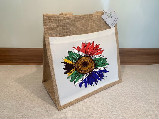 South African Flag Sunflower Jute Bag with fabric pocket. Eco-friendly Hessian Burlap Tote Reusable. Flag Art.