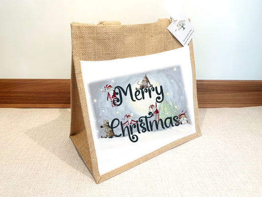 Christmas Shopping Jute Bag with fabric pocket. Eco-friendly Hessian Burlap Tote Reusable