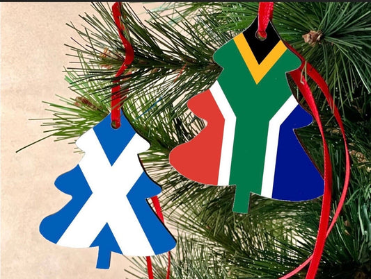 Christmas ornament double sided South African and Scotland Saltire Christmas Decoration. Tree shaped hanging ornament bright