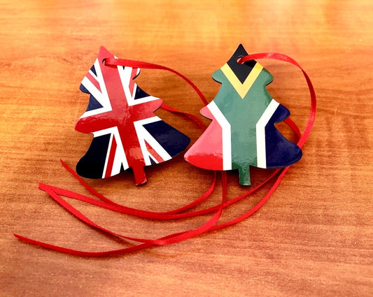 Christmas ornament Double sided South African United Kingdom Christmas Decoration. Tree shaped hanging ornament bright and colourful flags.