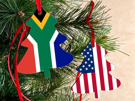Christmas ornament Double sided South African United States Christmas Decoration. Tree shaped hanging ornament bright and colourful flags.
