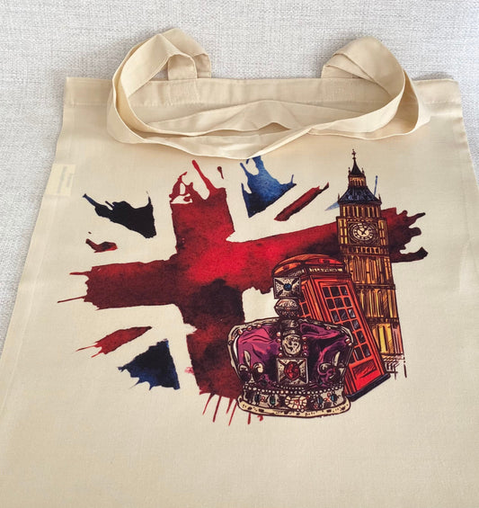 London Highlights natural tote bag. Gift from London Britain. London Souvenir. Big Ben Union Jack.