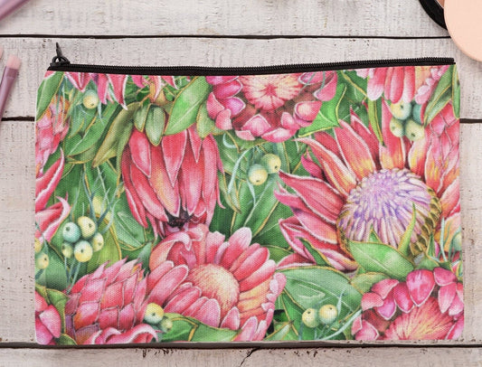 Linen Make up bag cosmetics pencil case with hot pink Protea design Zipped pouch.