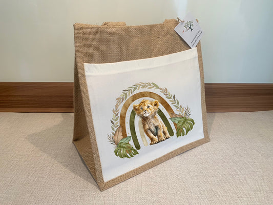 Lion Cub Jute Bag with fabric pocket. Eco-friendly Hessian Burlap Tote Reusable.