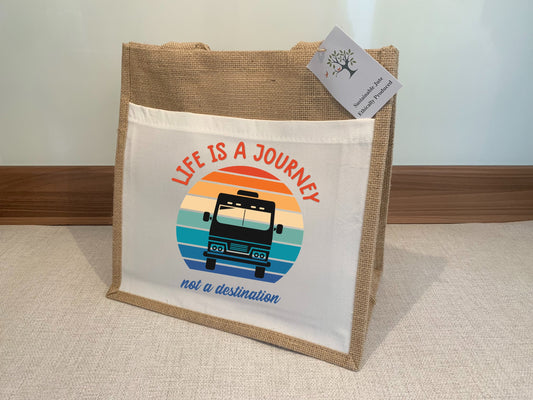 Motorhome Caravan RV bag Life is a journey, not a destination Jute Bag with fabric pocket. Eco-friendly Hessian Burlap Tote Reusable