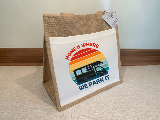 Motorhome Caravan Home is where we park it Jute Bag with fabric pocket. Eco-friendly Hessian Burlap Tote Reusable