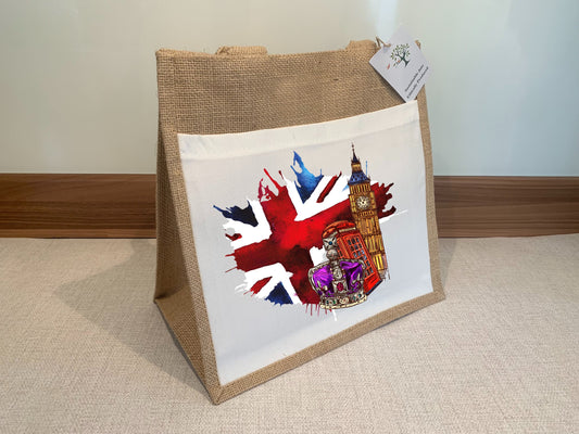 London Jute Bag with fabric pocket. Eco-friendly Hessian Burlap Tote Reusable Landmarks of London Britain. Union Jack. Gift from London.