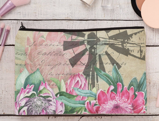 Make up bag Pencil case Karoo Windpomp and Protea design linen cosmetics or pencil case