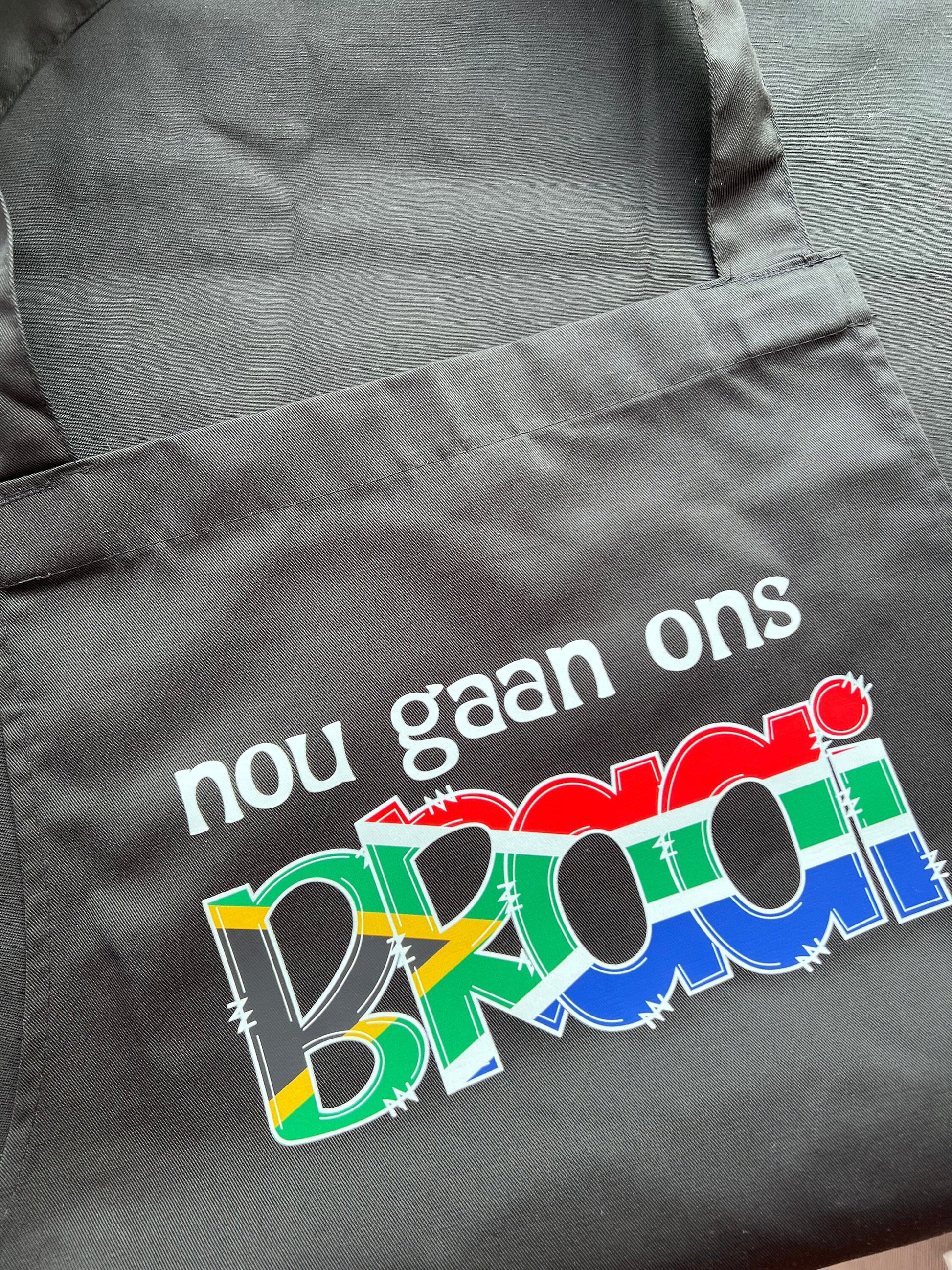 Braai / BBQ outdoor cooking apron featuring Afikaans slang "Nou gaan ons braai"