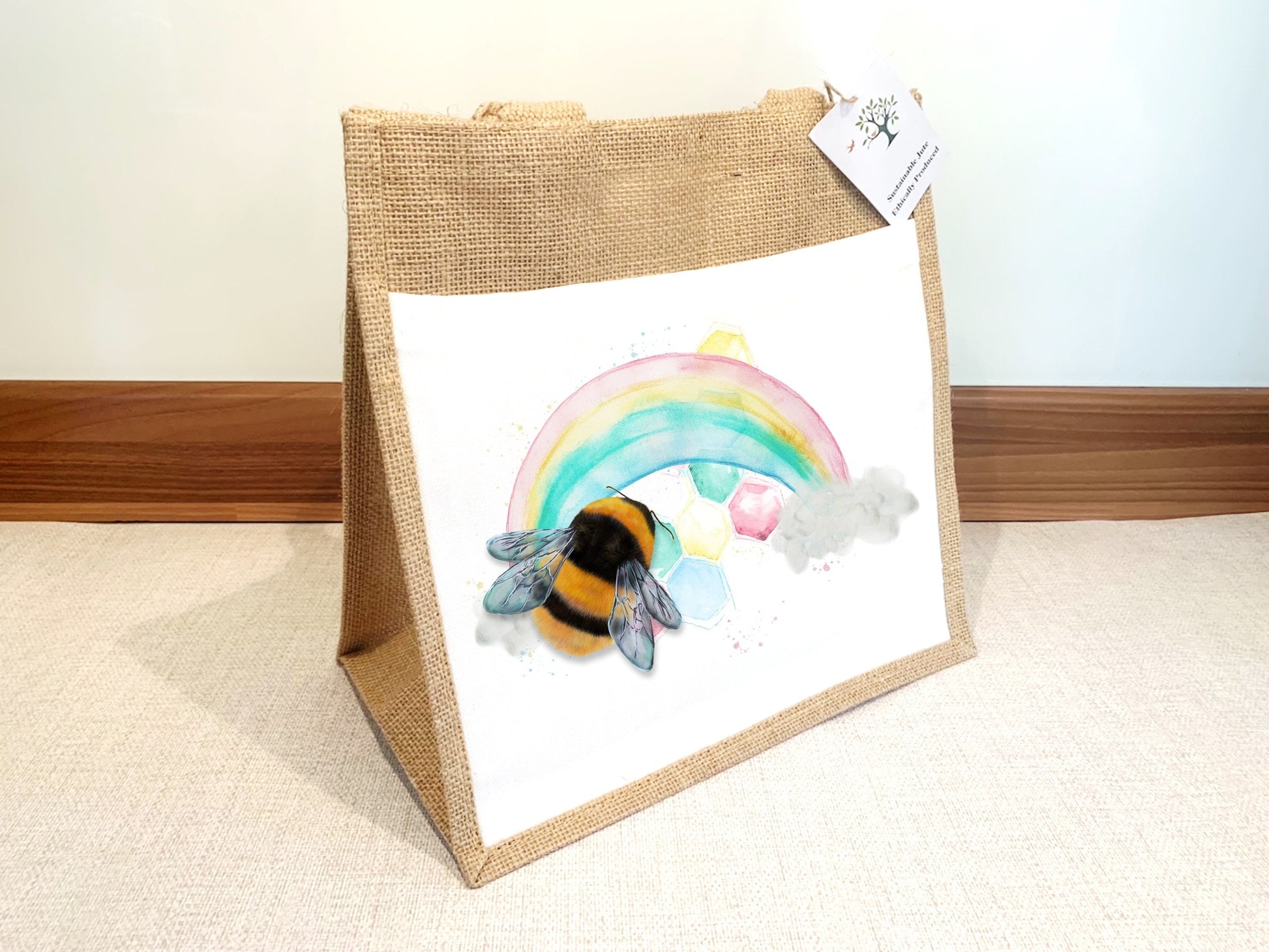 Jute Bag with a front pouch. Vibrant Bee and Rainbow design is printed on the fabric pocket.