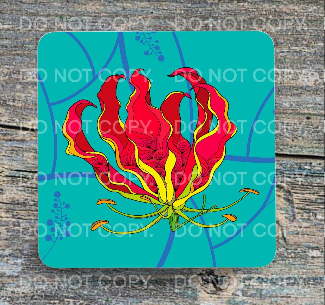 Available as an individual or in a set. Coasters featuring a botanical pattern of the iconic Zimbabwean South African Flame Lily Gloriosa Superba flower.