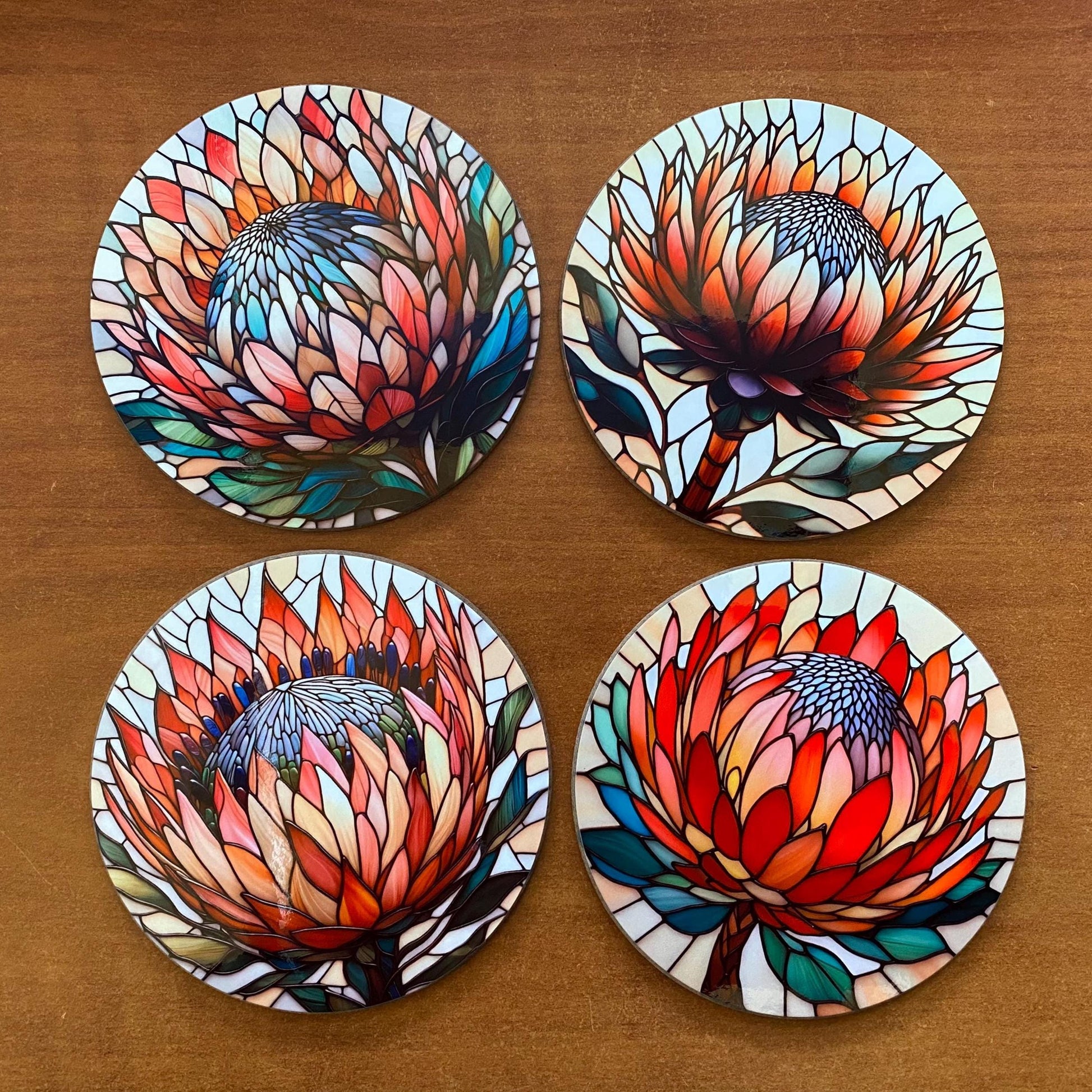 Elegant and stylish set of 4 coasters with a bright and vibrant design featuring a range of Proteas. The perfect addition to any coffee table or entertaining area.