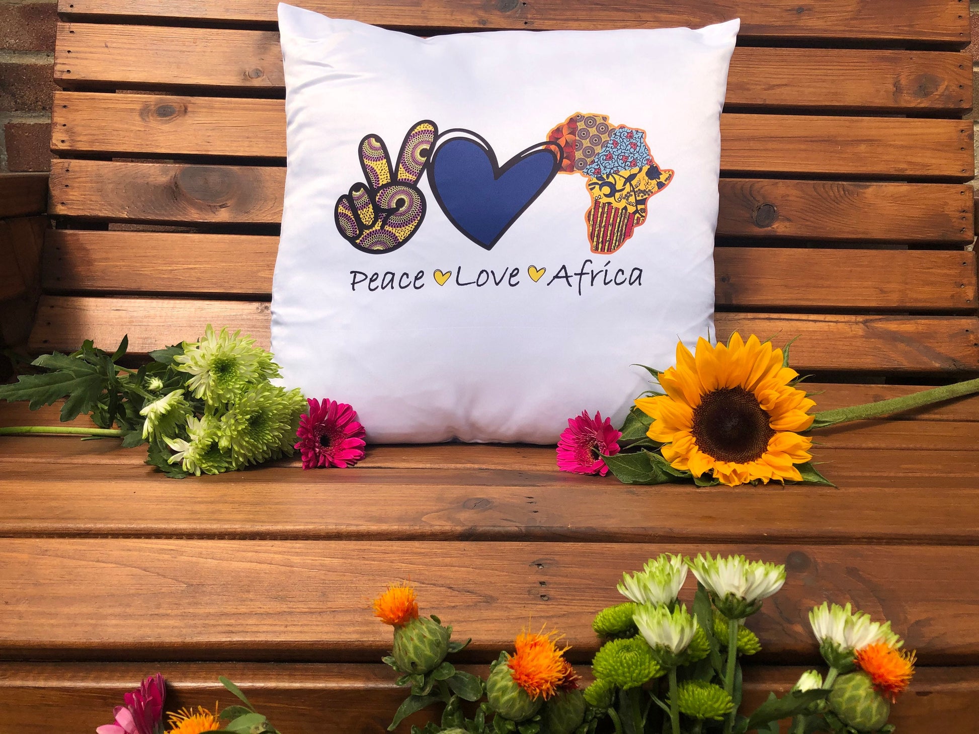 Cushion cover with a unique “Peace Love Africa” design. Plush white deluxe 'soft feel' scatter cushion. ( 40x40cm )