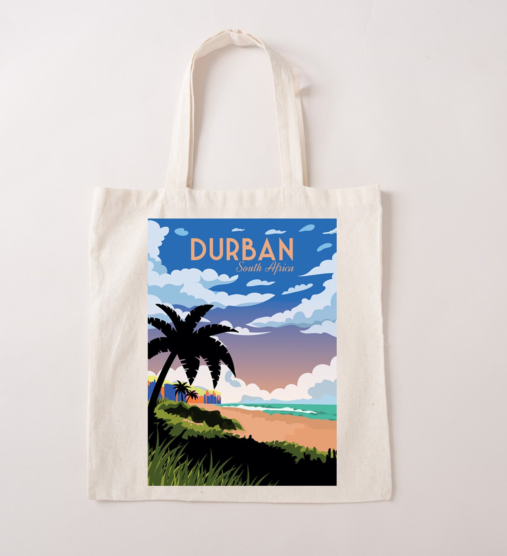The bag features a printed image of a vintage retro style travel poster of Durban (KwaZulu-Natal) South Africa.