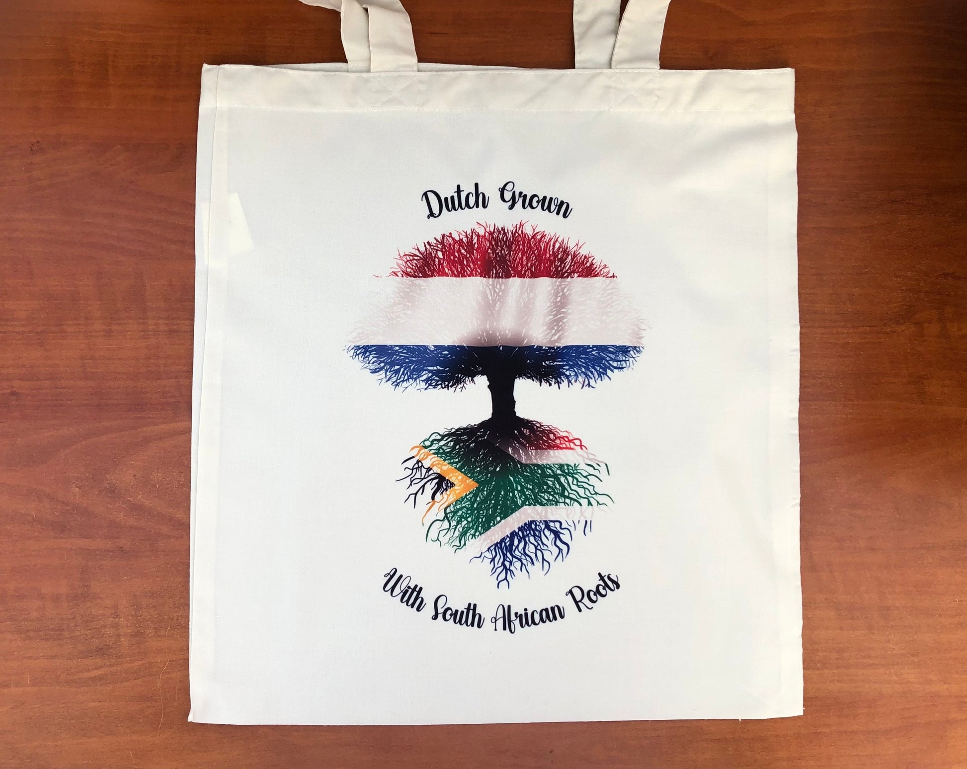 Fabric bag South African Flag The Netherlands 'Dutch Grown with South African Roots' natural fabric tote bag.