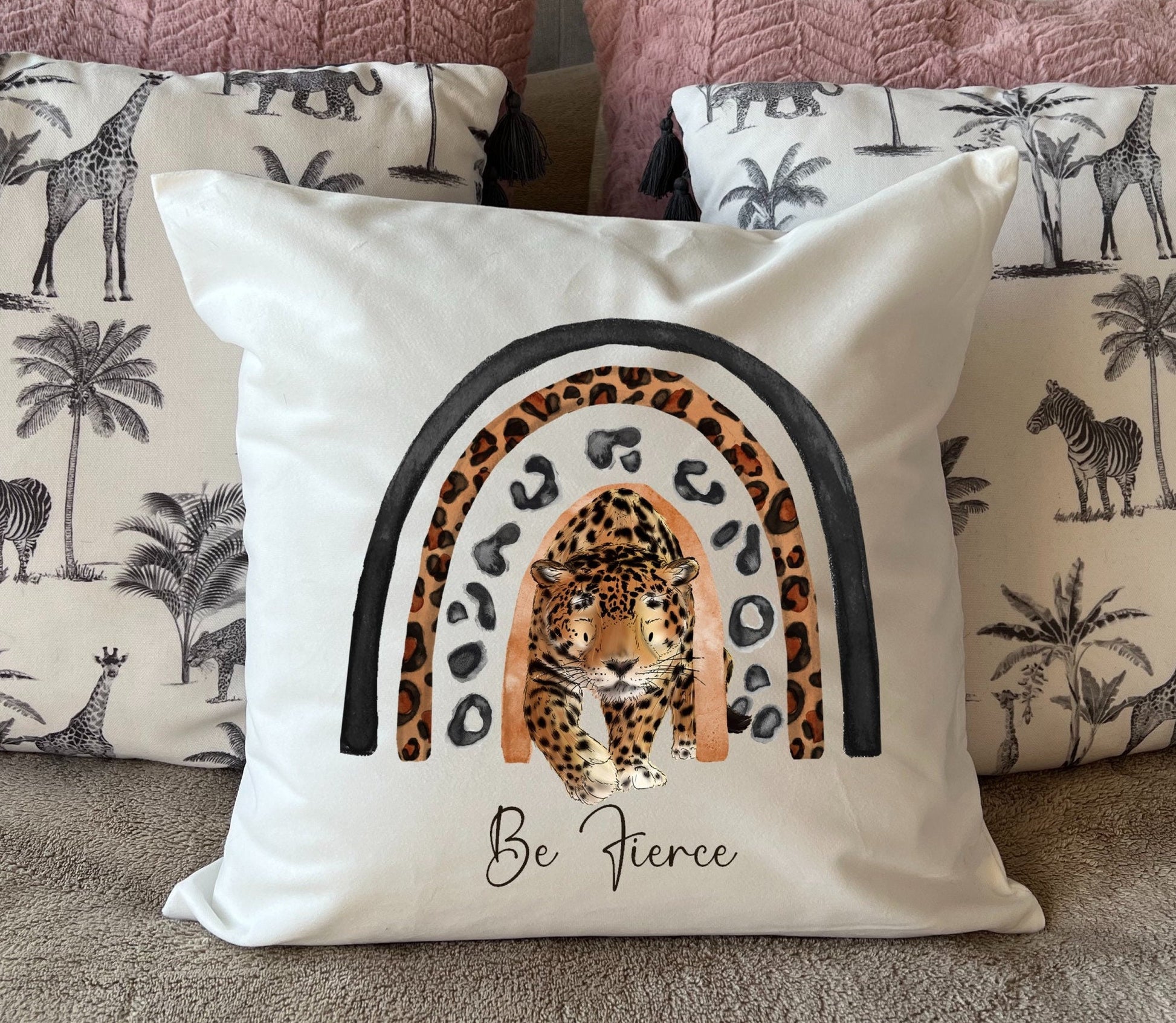 Hand Printed 'Be Fierce' Leopard plush white deluxe 'soft feel' scatter cushion.