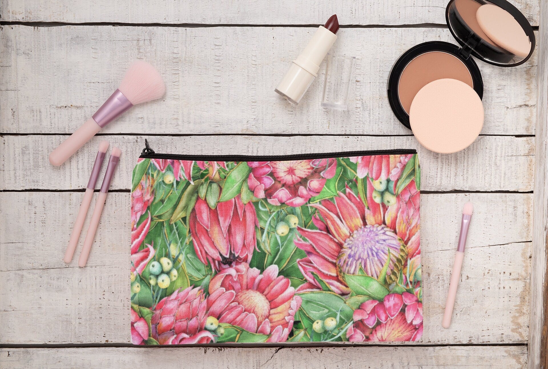 Linen Make up bag cosmetics pencil case with hot pink Protea design Zipped pouch.