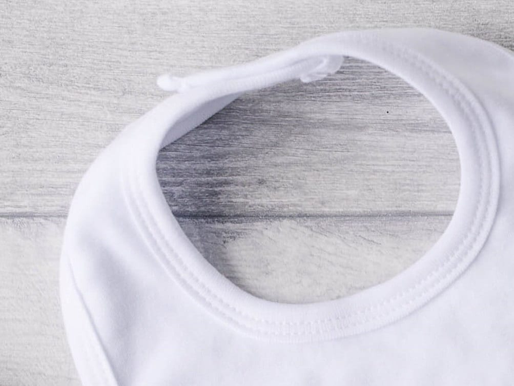 Bright white cotton towelling backed baby bib with fastening around the neck.