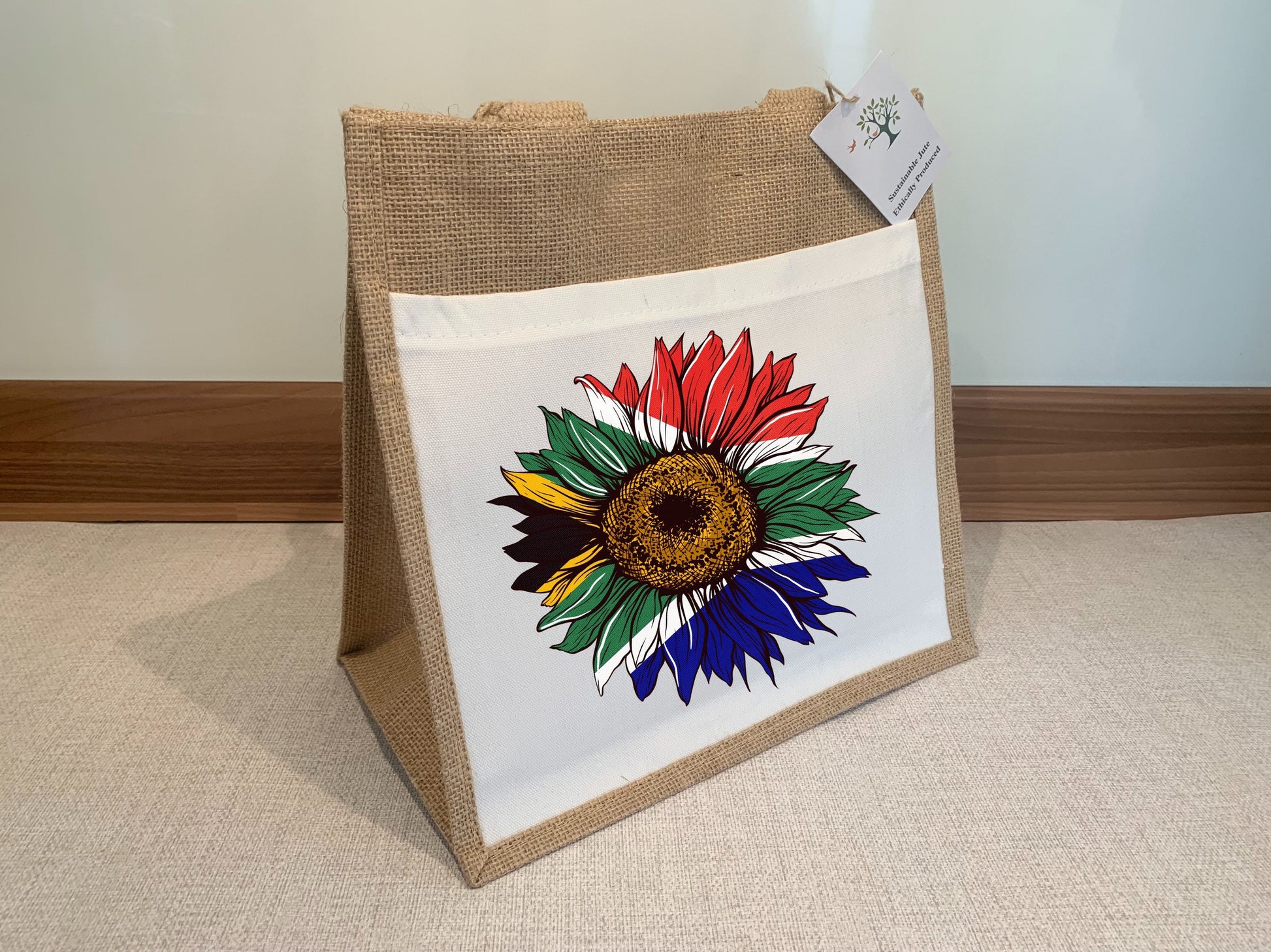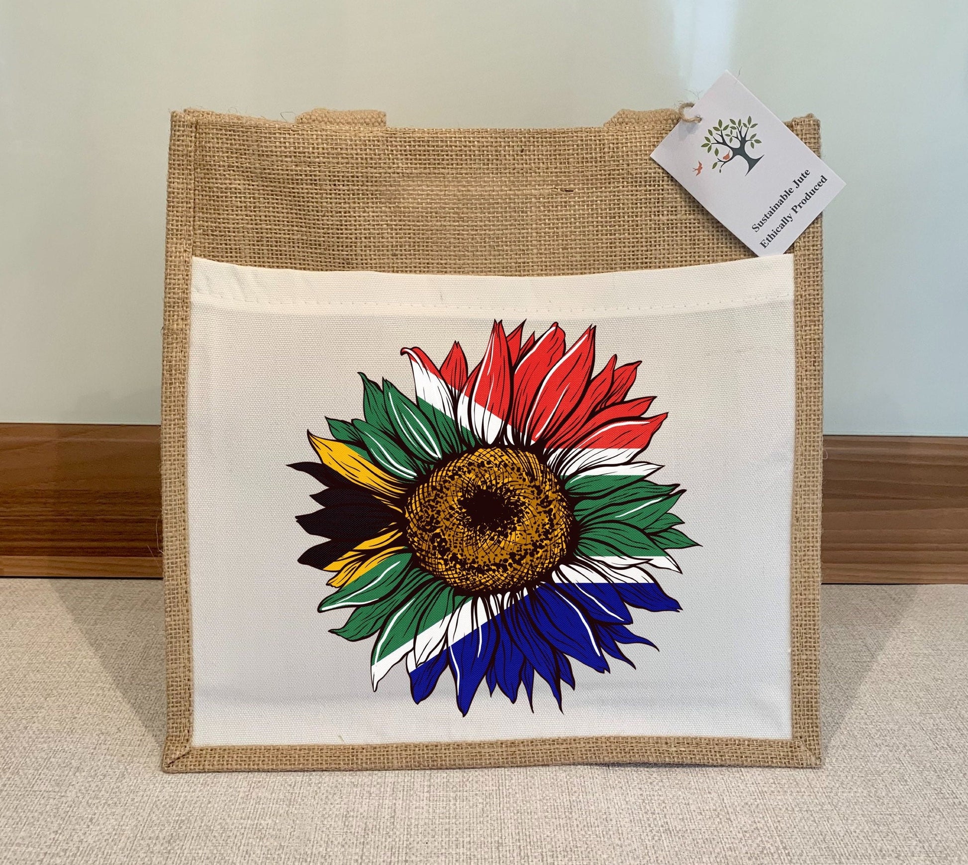 South African Flag Sunflower Jute Bag with fabric pocket. Eco-friendly Hessian Burlap Tote Reusable. Flag Art.