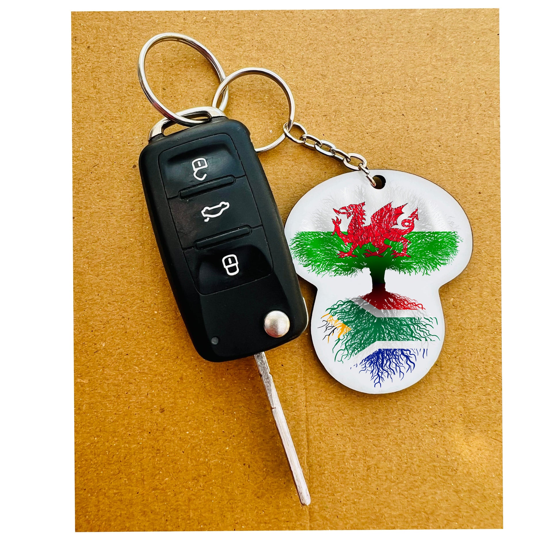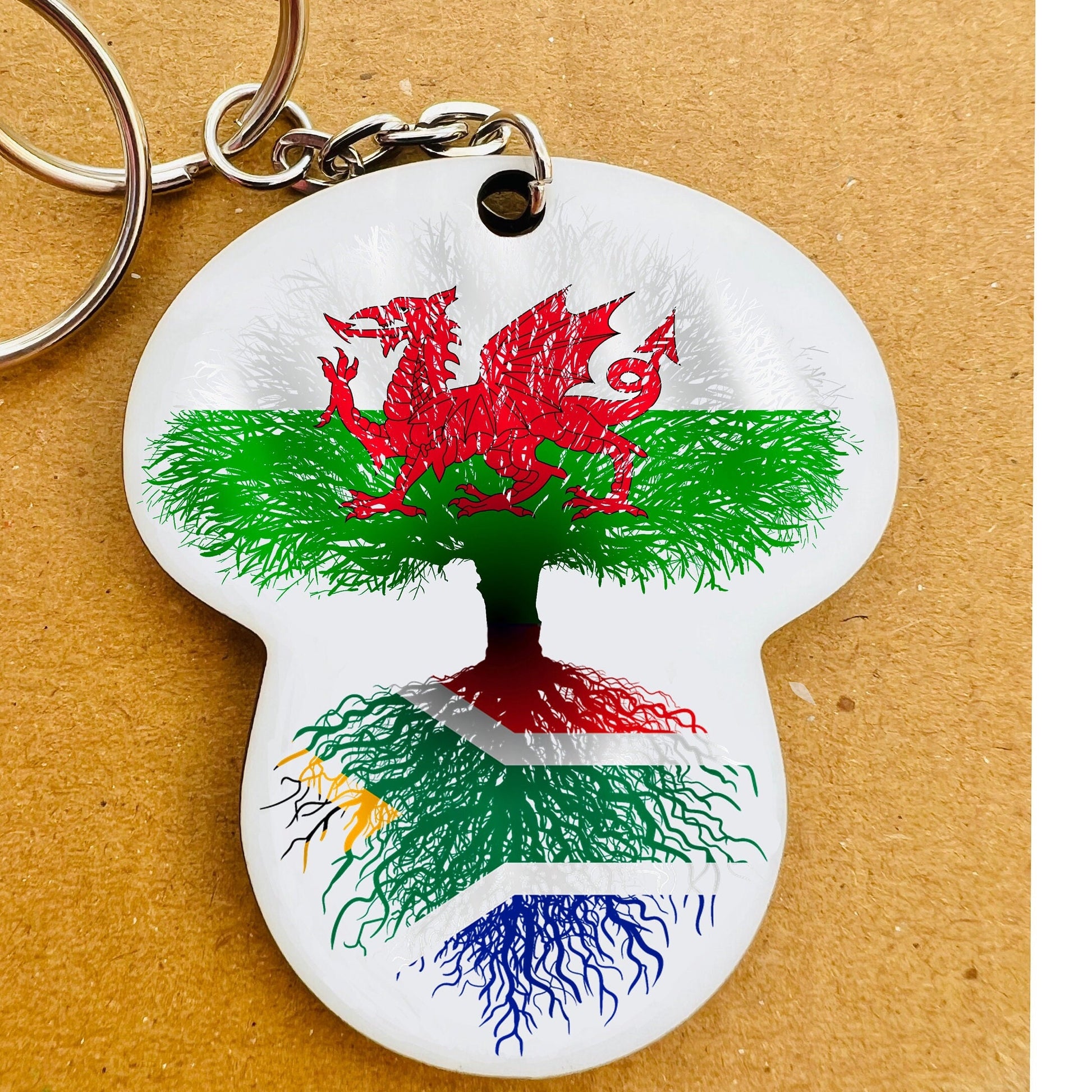 Celebrate your heritage with this unique South African roots keyring/keychain. Featuring South African roots with Wales/Welsh Flag Dragon branches.