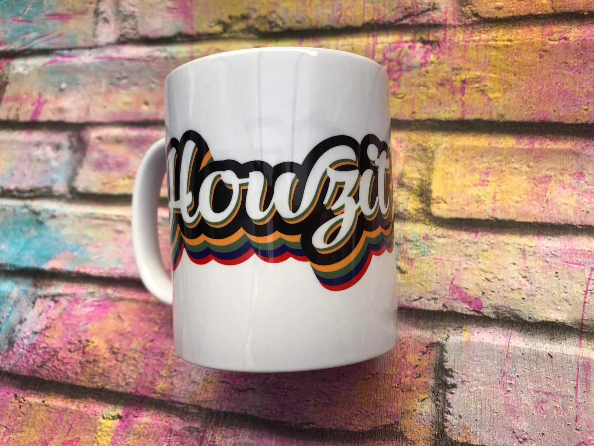 Beautiful South African 11oz Howzit mug and a specially made Voetsek coaster to match, underpinned by the colours of the South African flag.
