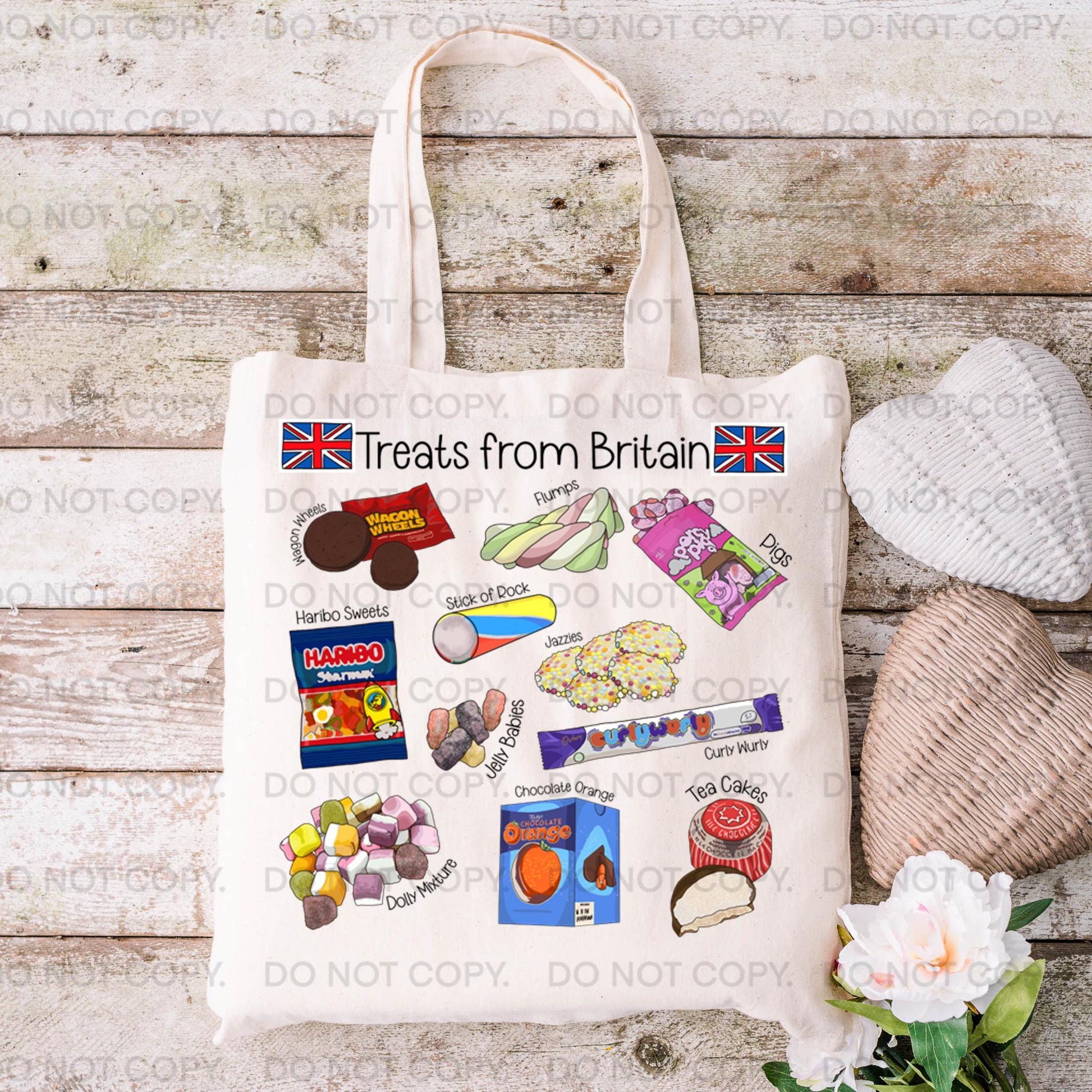 Travel Gift Tote Bag London UK Britain Souvenir Sweets Chocolate Treats Reusable Unique Art Canvas Shopping Books